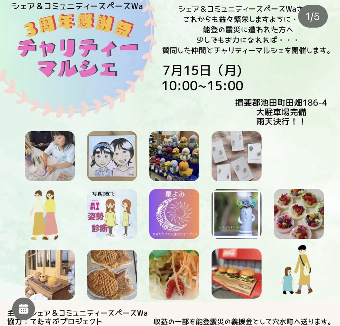 シェア&コミュニティースペースWa 3周年感謝祭 2024 7/15 マルシェ 2024年7月15日 とても暑い日でしたが、たくさんの方に ご来場くださいましてありがとうございます 主催者様、出店者の皆さん楽しい日を共有 できた事感謝します マルシェ よかったらシェアしてね! URLをコピーしました! URLをコピーしました! Your,G U R T&G RAN OL A ぬくいの湯 関連記事 2024年12月5日魔女会 2024年12月8日 2024年11/29.30メリーマルシェ 2024年11月30日 2024/11/24 ボタニカルキャンプ 2024年11月24日 2024/11/16明治安田生命岐阜駅前営業所イベント 2024年11月16日 2024/11/8岐阜マルシェ 2024年11月8日 フジワマルシェ 2024年10月13日 仕事コネクト 2024年9月23日 2024/9/13 モデルハウスマルシェ 2024年9月13日