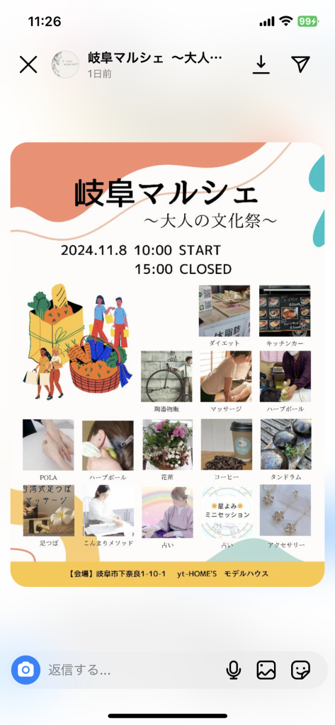 2024/11/8岐阜マルシェ 2024 11/08 マルシェ 2024年11月8日 オシャレなモデルルームの書斎で 落ち着いて鑑定できました! ご来場者様、主催者様、出店者様 ありがとうございます マルシェ よかったらシェアしてね! URLをコピーしました! URLをコピーしました! フジワマルシェ 2024/11/16明治安田生命岐阜駅前営業所イベント 関連記事 2024年12月5日魔女会 2024年12月8日 2024年11/29.30メリーマルシェ 2024年11月30日 2024/11/24 ボタニカルキャンプ 2024年11月24日 2024/11/16明治安田生命岐阜駅前営業所イベント 2024年11月16日 フジワマルシェ 2024年10月13日 仕事コネクト 2024年9月23日 2024/9/13 モデルハウスマルシェ 2024年9月13日 Lulien マルシェ 2024年9月7日